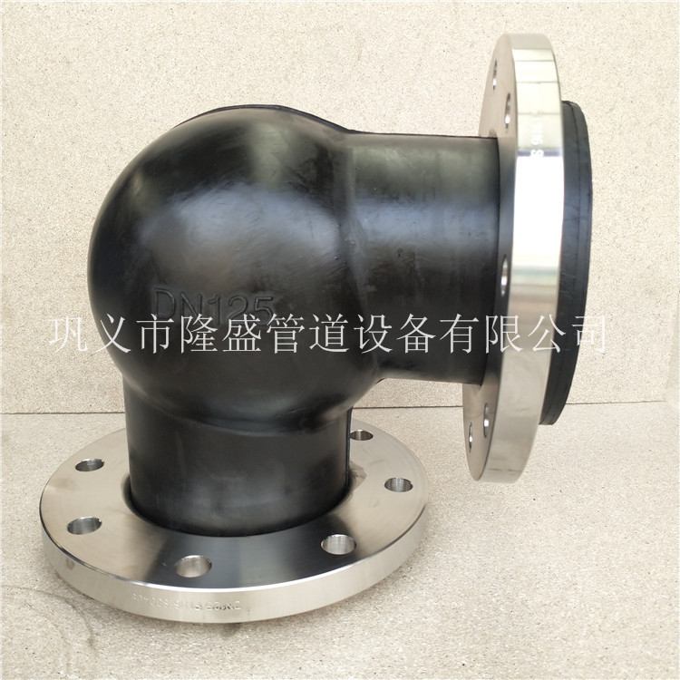 KXT(JGD)型可曲撓90°橡膠彎頭的稱通徑,長度,位移值與法藍數據表(異徑)設備結構 橡膠接頭又可稱為:可曲撓橡膠接頭、橡膠軟連接、軟接頭、柔性橡膠接頭、橡膠膨脹節、避震喉、減震器等,是一高彈性、高氣密性、耐介質和耐氣候性的管道連接件。 橡膠接頭一般由內膠層、織物增強層(增強層有多層刮膠錦綸簾子布)、中膠層、外膠層、端部加固金屬環或鋼絲圈,經高溫、高壓硫化成型后,與金屬法蘭或平行接頭松套組合而成的復合橡膠管。此產品利用了橡膠的高彈性、高氣性、耐介質性、耐候性和耐輻射性等優點,可降低管道的振動及噪聲,并可對因溫度變化引起的熱脹冷縮起補償作用。 根據介質不同所采用的橡膠材質也不同,有天然膠、丁苯膠、丁基膠、丁腈膠、三元乙丙膠、氯丁膠、硅橡膠、氟橡膠等等。分別具有耐熱、耐酸、堿、耐腐蝕、耐磨、耐油等功能。